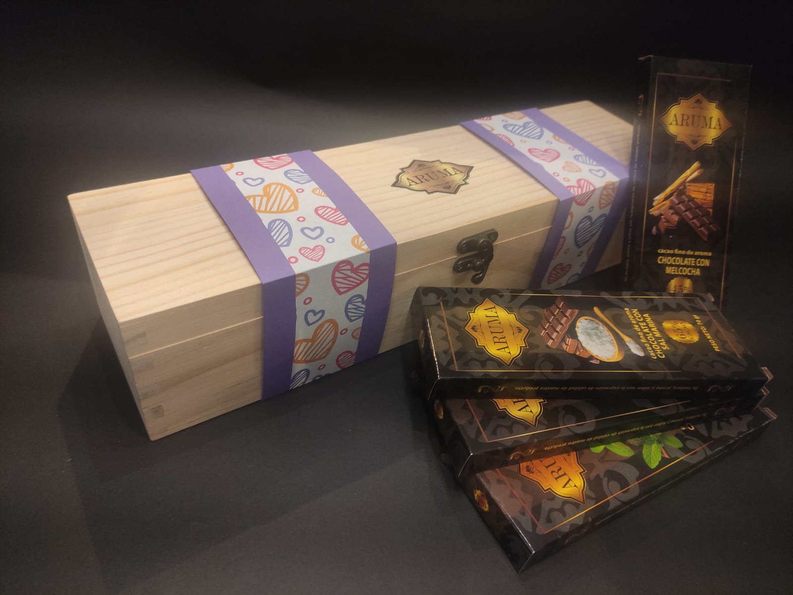 Caja de madera de balsa de 37 x 10 x 8 cm, decorada con detalle de color lila con 10 barras de chocolates de 70gr cada una. Incluye: 1 barra al 45% cacao con melcocha, 3 barras de cada sabor al 65% cacao sabor menta, caramelo y sal marina.