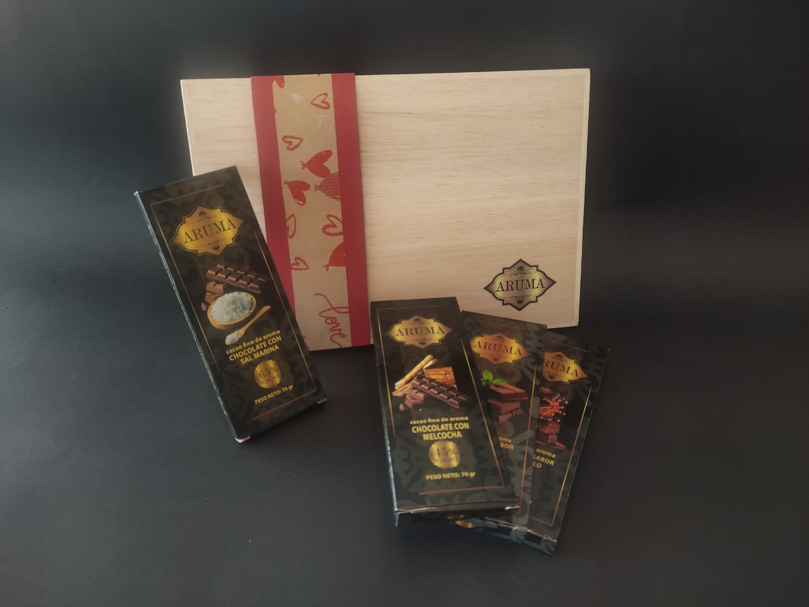 Caja de madera de balsa de 29 x 18 x 3 cm, decorada con detalle de color rojo con 4 barras de chocolates de 70gr cada una. Incluye: 1 barra al 45% cacao con melcocha, 3 barras al 65% cacao sabor menta, caramelo y sal marina.