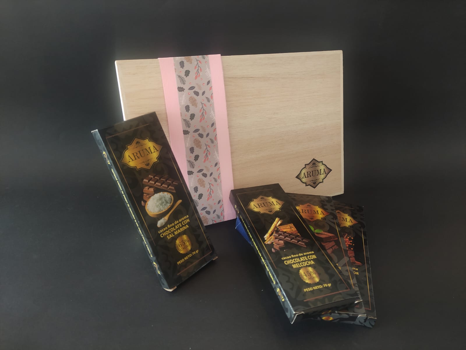 Caja de madera de balsa de 29 x 18 x 3 cm, decorada con detalle de color rosado con 4 barras de chocolates de 70gr cada una. Incluye: 1 barra al 45% cacao con melcocha, 3 barras al 65% cacao sabor menta, caramelo y sal marina.