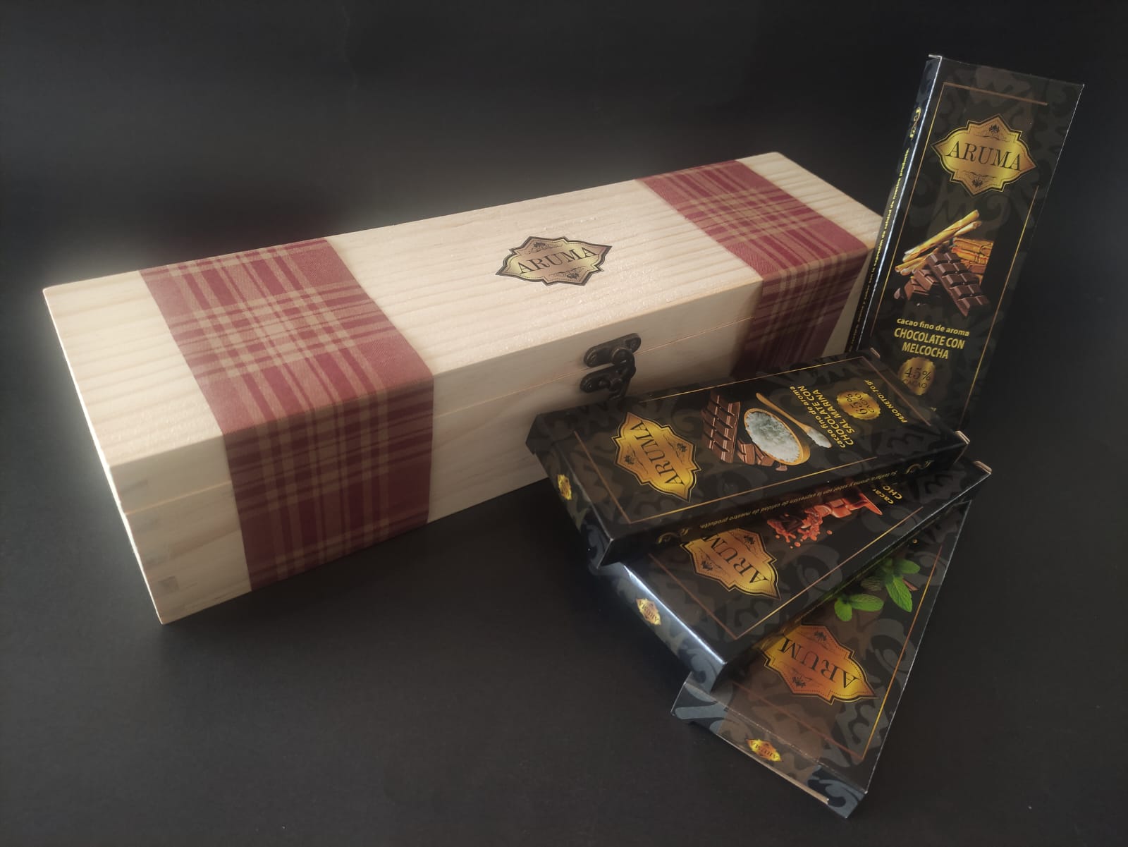 Caja de madera de balsa de 37 x 10 x 8 cm, decorada con detalle tipo escosés con 10 barras de chocolates de 70gr cada una. Incluye: 1 barra al 45% cacao con melcocha, 3 barras de cada sabor al 65% cacao sabor menta, caramelo y sal marina.